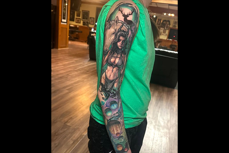 Trent Tieso is a Cedar Rapids–based tattoo artist with a fine art background in oil painting and pastels. He specializes in traditional, illustrative, neo-traditional, and realism, blending classical techniques with bold, modern tattoo design. His strong composition and rich color theory bring every piece to life.